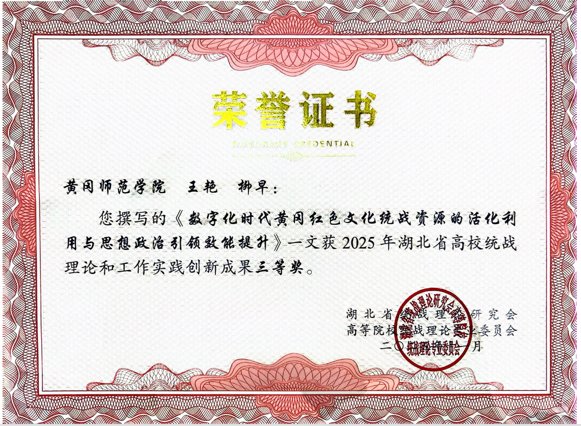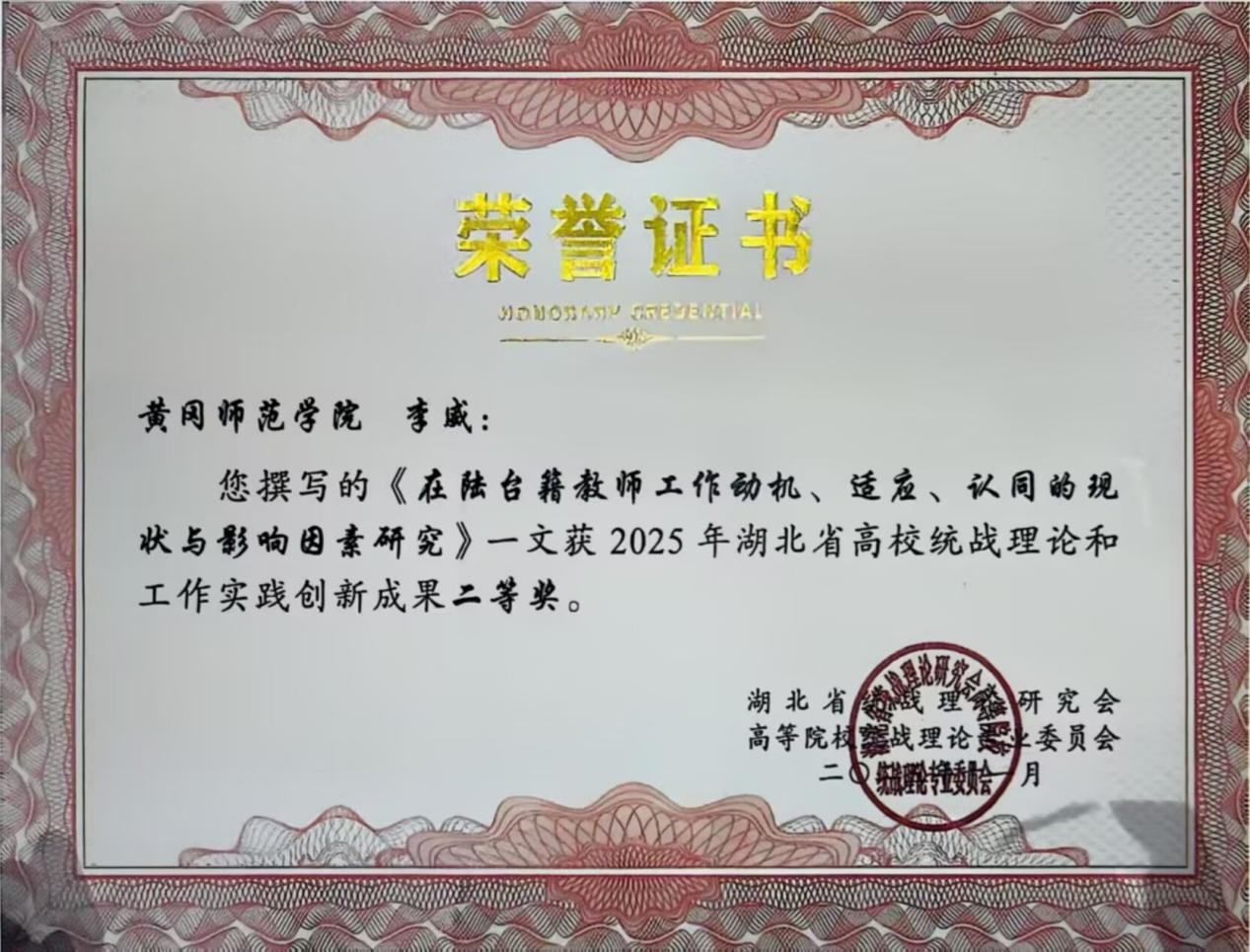 11月5日至11月7日,湖北省高校统战理论研究会第40次年会在长江大学召开,对2025年全省高校统战理论和工作实践创新成果进行表彰。我校李威老师撰写的《在陆台籍教师工作动机、适应、认同的现状与影响因素研究》荣获优秀论文二等奖,王艳老师撰写的《数字化时代黄冈红色文化统战资源的活化利用与思想政治引领效能提升》荣获优秀论文三等奖。